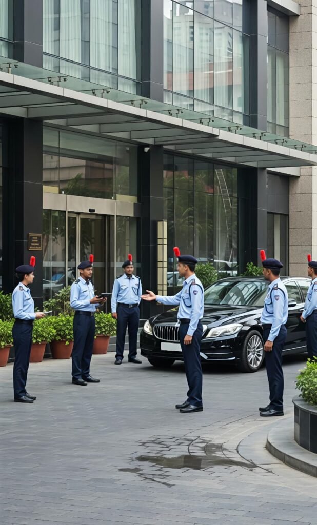 Professional guards deployed at entrances, reception areas, corridors, and hotel premises.